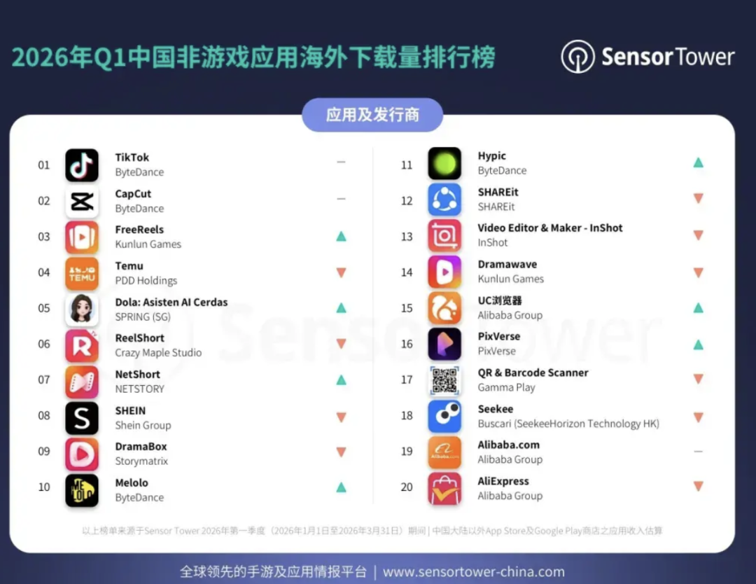 4 月 14 日,Sensor Tower 发文称,2026 年第一季度全球非游戏移动应用市场整体保持增长,下载量与收入均实现提升。