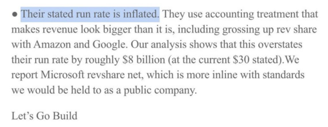 但备忘录指出,Anthropic 采用「总额法」将客户通过 AWS、Google Cloud 等云平台支付的全部金额计入收入(含分给云服务商的分成),从而虚增约 80 亿美元。若采用 OpenAI 使用的「净额法」(仅计扣除微软分成后的净收入),其实际年化收入约为 220 亿美元,并未超过 OpenAI。OpenAI 强调,净额法「更符合上市公司应遵循的标准」。(来源:钛媒体)