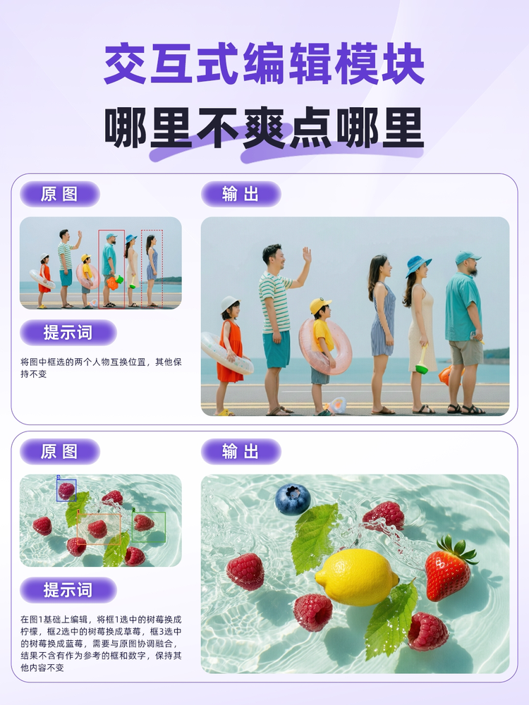 如果说生图能力是创作的基石,那么编辑功能则赋予了创作者掌控力。Wan2.7-Image原生支持交互式编辑模块,更懂创作者的需求——“哪里不爽点哪里”,用户可通过精准框,在指定区域元素添加、对齐、移动元素或logo,实现像素级意图对齐。
