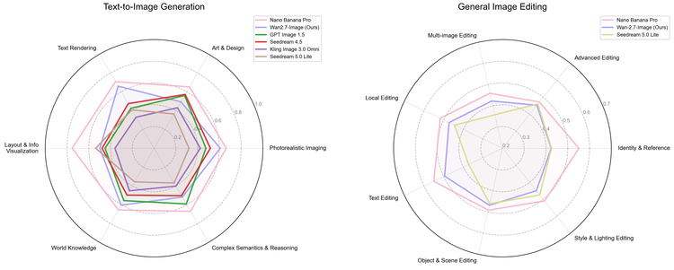 Wan2.7-Image具备文生图、图生组图、图像指令编辑和交互式编辑等全链路能力。在人类偏好盲测中,“文生图”能力超过GPT-Image1.5和国内主流模型,在文本渲染、照片级成像和世界知识指标上,接近Nano Banana Pro。