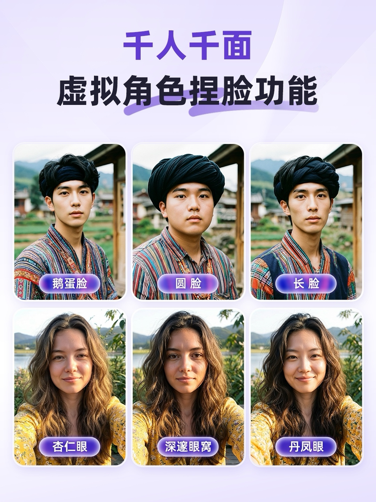 为告别千篇一律的“AI脸”,Wan2.7-Image强化了虚拟形象捏脸功能,支持从骨相、眼眸到五官细微处的全方位定制,比如更换提示词中的脸型(鹅蛋脸、圆脸、方脸、长方脸等)、眼部特征(杏仁眼、深邃眼窝、圆眼、丹凤眼等),实现“千人千面”。