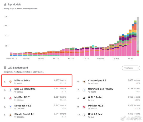 具体来看,MiMo-V2-Pro最近一周token消耗量一举突破4万亿,蝉联周榜第一。最新月榜数据显示,MiMo-V2-Pro上线不到半个月时间,累计token消耗量已超6万亿,成为新晋月榜第一大模型。