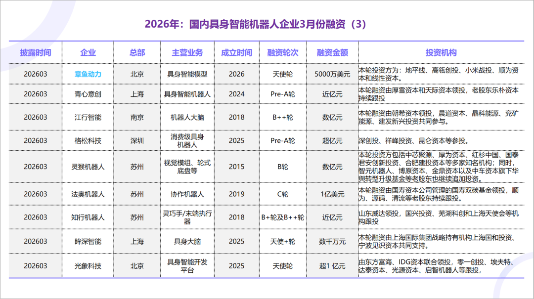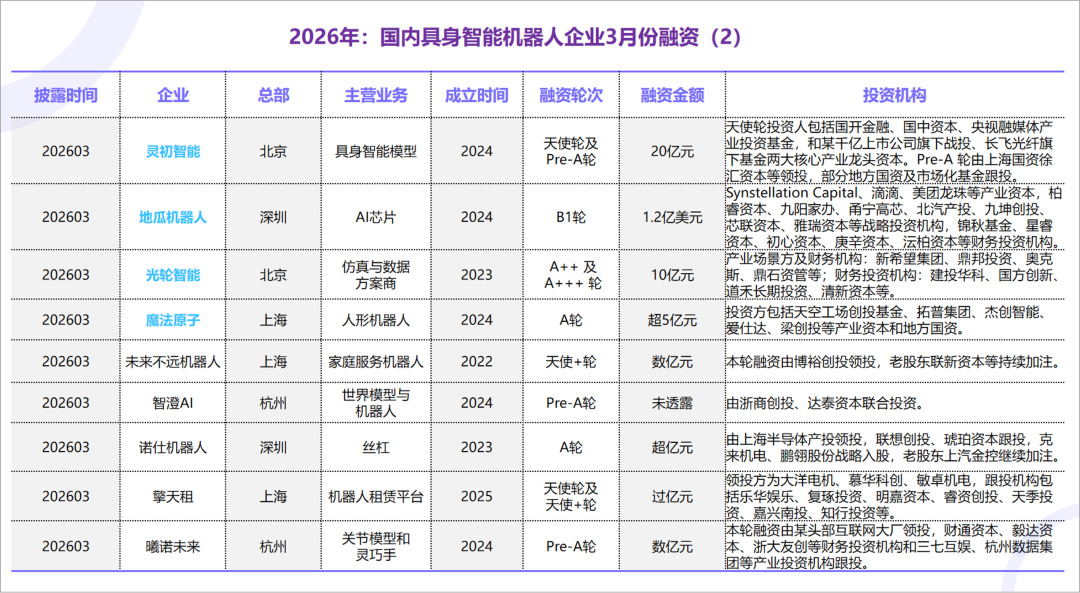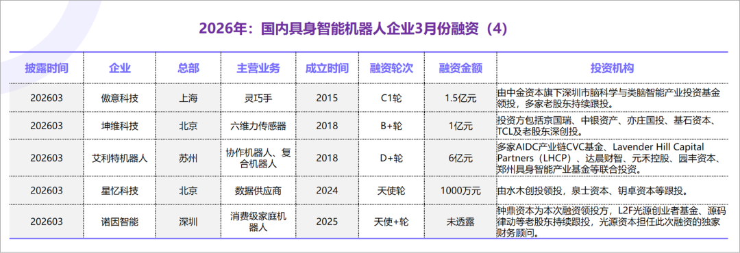 原文标题 : 2026年3月,国内具身智能机器人企业融资情况汇总