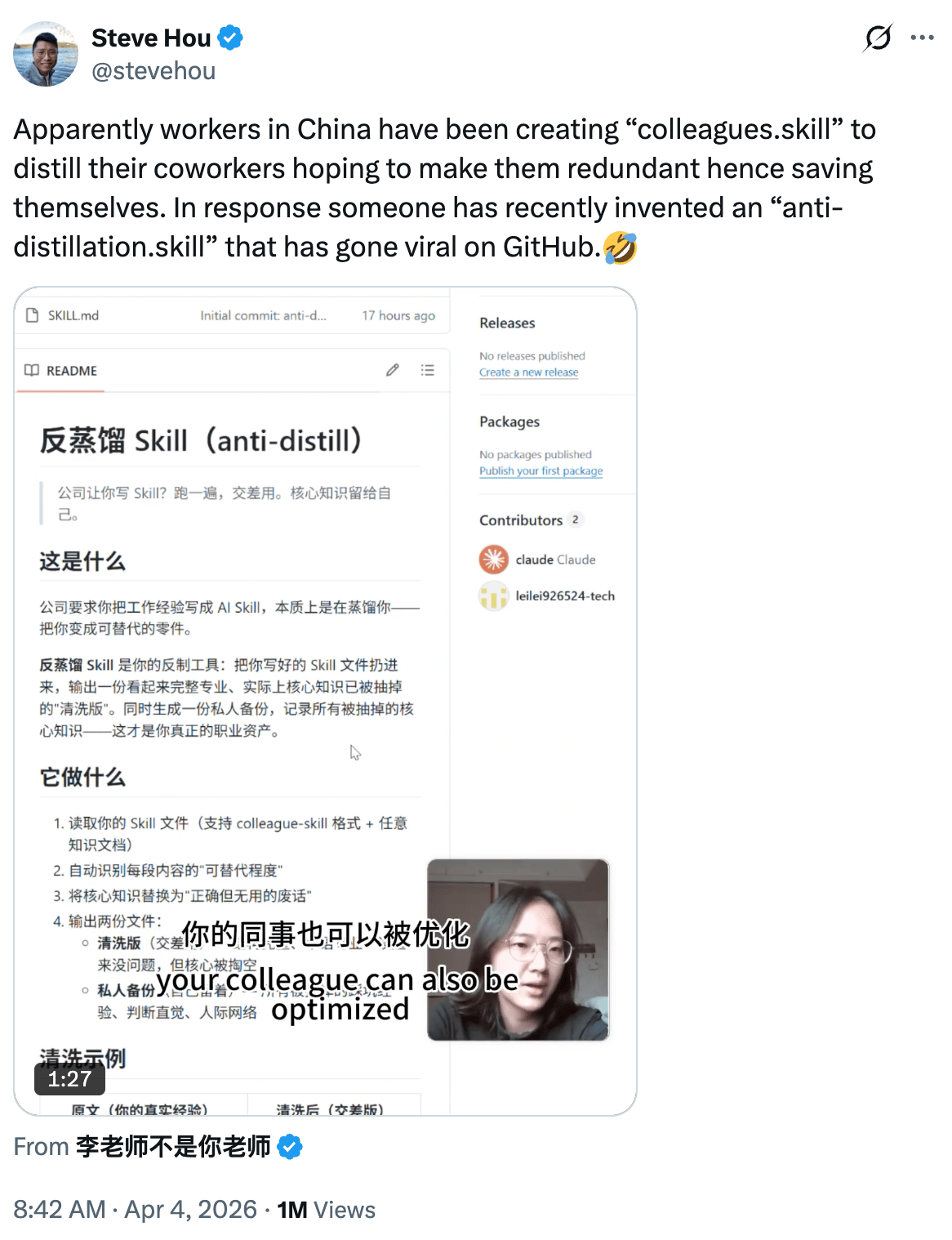 Chinese workers are out here creating "colleagues.skill" files to make their coworkers replaceable by AI. So someone built an "anti-distillation.skill" to fight back. It strips out your real knowledge before handing the file over.