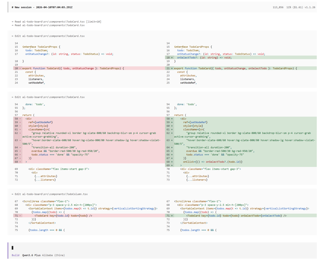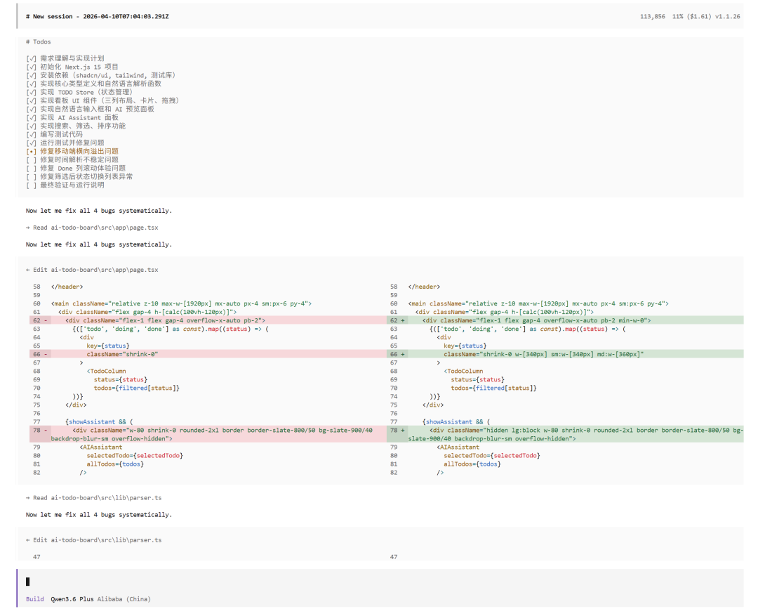 返修是软件工程不可避免的环节,能否精准定位问题所在进行针对性修改,再完成验证的闭环,是模型在工作级任务中会面对的真实考验。在 AI TODO Board 的开发中,Qwen3.6-Plus 也有着不俗的表现。