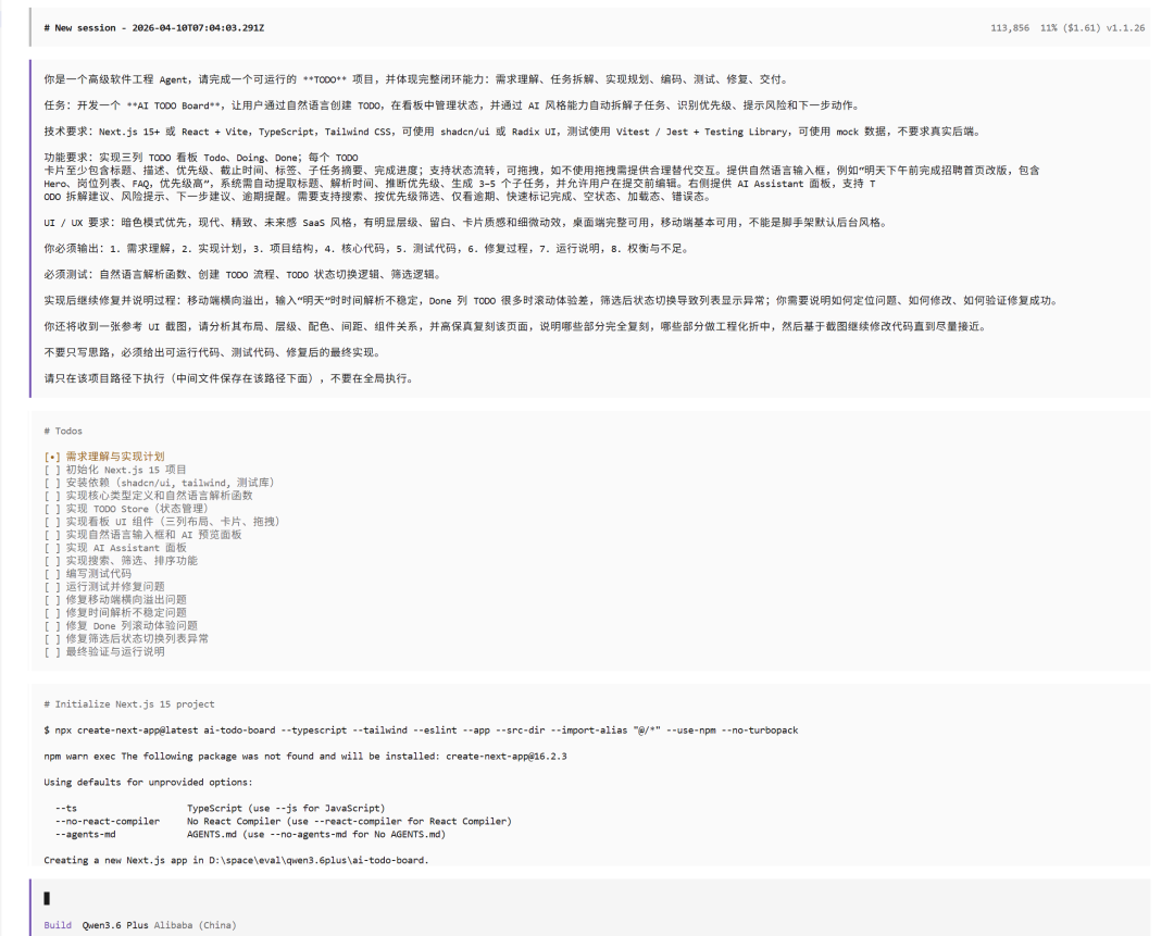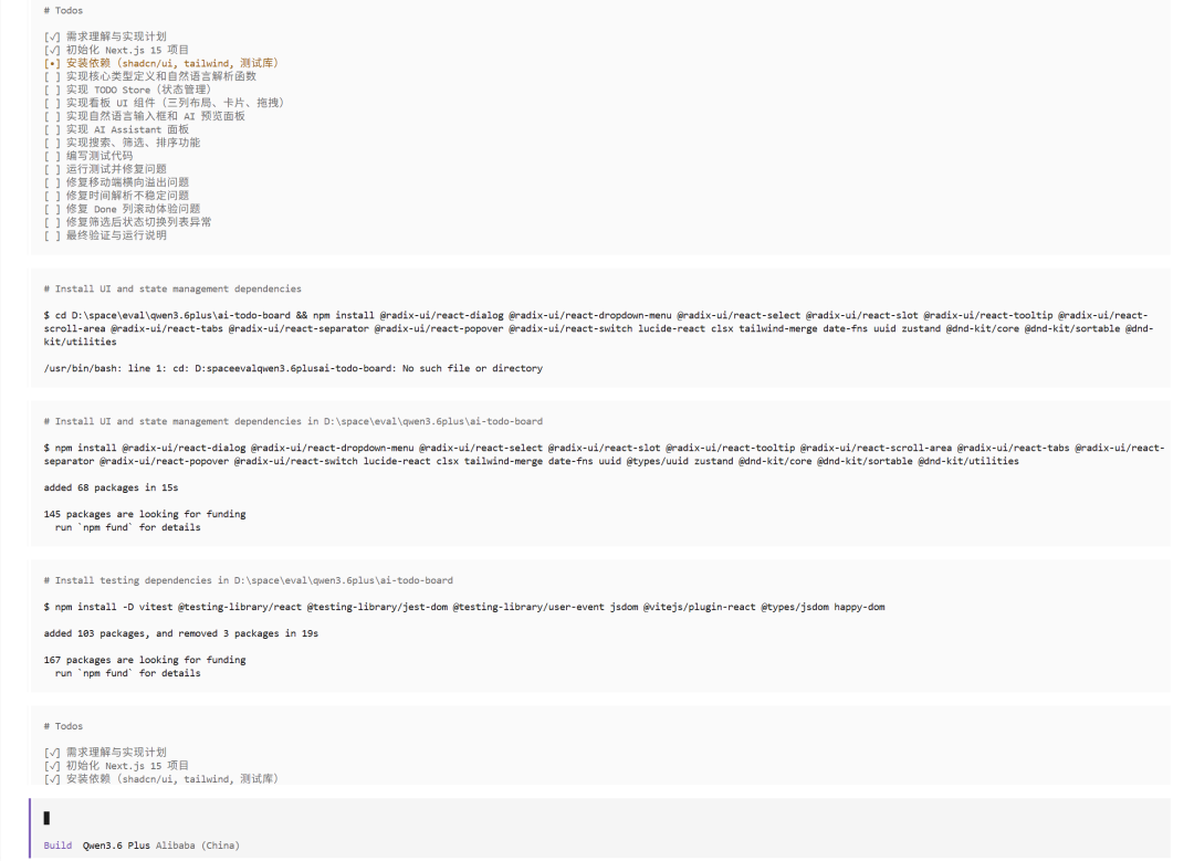 项目启动阶段,Qwen3.6-Plus 首先进行了需求拆解,精准把握 AI TODO Board 开发的核心技术,还制定了包含 16 个步骤的清晰实现计划。从项目初始化、依赖安装,到核心功能开发、测试编写,再到问题修复,这套方案可以直接交给工业级软件工程团队去执行,而且每一步均以可视化进度条实时呈现进展。