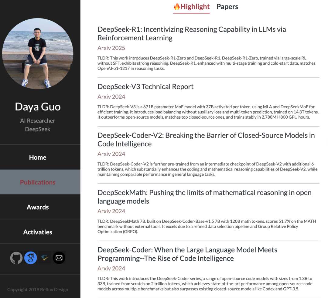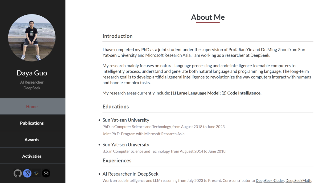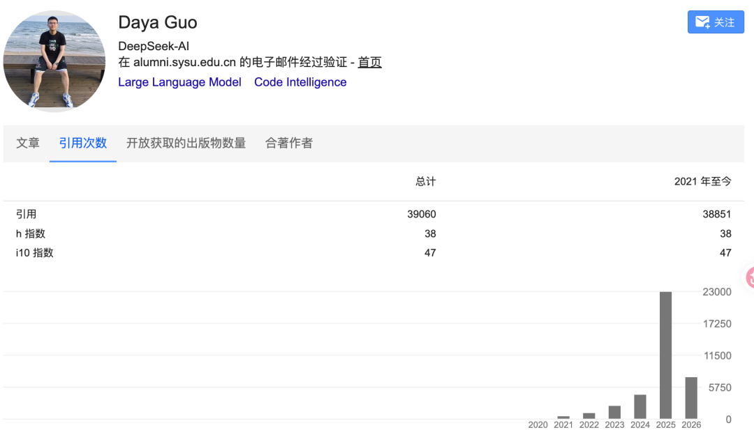 郭达雅2023年博士毕业后加入DeepSeek,title是AI Researcher。公开论文显示,从 DeepSeek-Coder、DeepSeek-Math、DeepSeek-Prover、DeepSeek-V3到 DeepSeek-R1,他都出现在核心作者名单中。