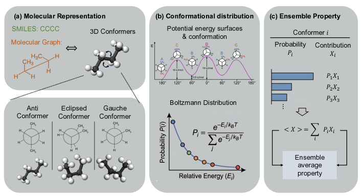 在药物研发与新材料设计领域,相对微观的 3D 构象动力学与相对宏观的物化性质之间,长期存在着难以贯通的尺度断层。一个候选药物能否成药,不仅取决于其静态的二维拓扑结构,更取决于其在溶液中千变万化的三维构象系综;根据玻尔兹曼分布,分子在室温下可能同时存在数十种乃至上百种低能构象,而宏观的溶解度、熔点、毒性等关键性质,正是这些构象的系综平均结果。