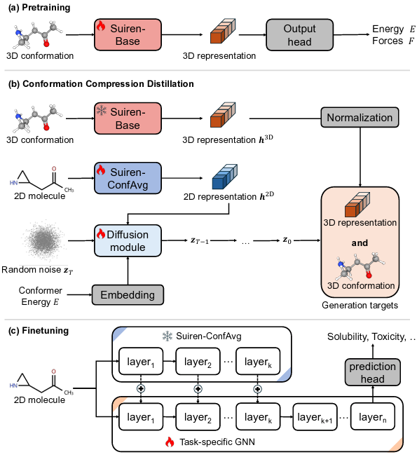 这一过程如同将复杂的 3D 构象系综「蒸馏」为一瓶浓缩的精华,Suiren-ConfAvg 也由此诞生。它不仅继承了 Suiren-Base 的量子力学直觉,更具备从 SMILES 或分子图直接生成构象平均表征的能力,实现了从「分子图纸」到「真实物性」的直接映射,而无需耗时的 3D 构象采样。