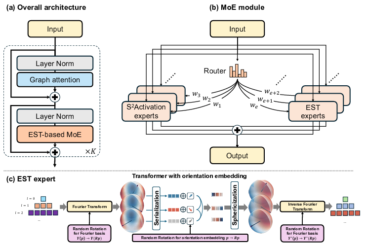 Suiren-Base 是一个拥有 18 亿参数的大型 SO (3)/SE (3) 等变图神经网络,采用稠密混合专家架构(MoE),集成 20 个 S2Activation 专家与 20 个 EST(Equivariant Spherical Transformer)专家。该模型在 7000 万组 DFT(密度泛函理论)第一性原理数据(Qo2mol 数据集)上进行有监督和 EMPP(Equivariant Masked Position Prediction)自监督混合预训练,精准捕捉单分子 3D 构象的量子力学特征。模型在原子级能量预测上达到 0.258 meV 的 MAE,力场预测达到 0.510 meV/Å,较传统模型大幅降低了误差。