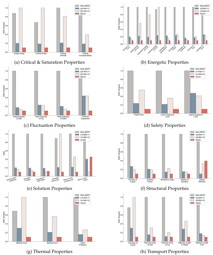 为系统验证 Suiren 1.0 的整体能力,研究团队构建了 MoleHB(Molecular Handbook Benchmark)综合基准测试集,涵盖 40 余项分子性质预测任务,覆盖安全性质、表面性质、热性质、溶解性质等八大领域。该基准在任务设计与评测指标上充分对齐当前分子机器学习领域的通行设置与主流评价体系。