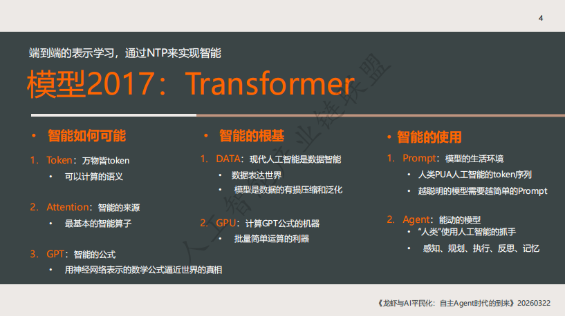 而支撑这一切的,是数据(世界模型的有损压缩与泛化)和GPU(批量简单运算的利器)。最终,人类通过Prompt与AI交互,通过Agent让AI真正“动起来”。