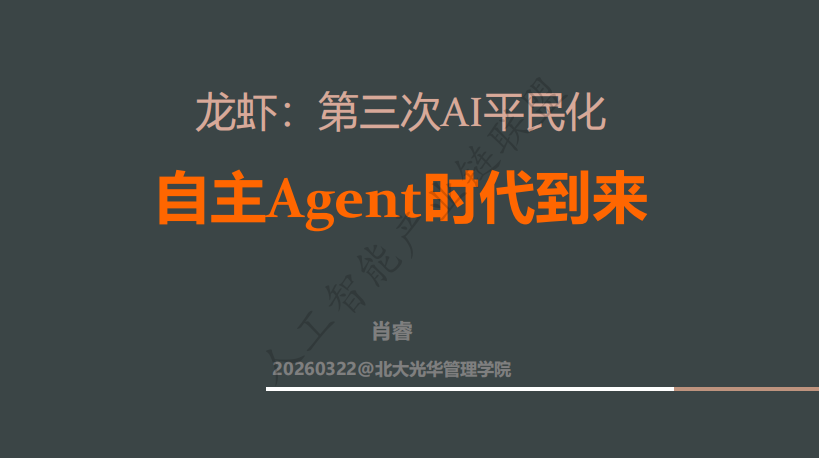 北大光华管理学院,肖睿带来了关于“第三次AI平民化——自主Agent时代”的深度分享。从ChatGPT到DeepSeek,再到如今的OpenClaw(龙虾),AI正在经历一场从“对话者”到“行动者”的惊人跃迁。而你,准备好了吗?