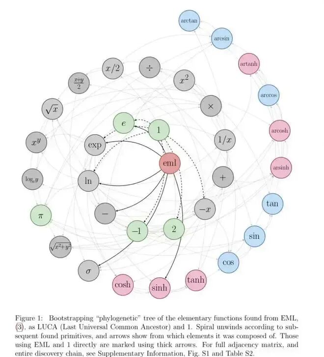 波兰物理学家奥德尔齐沃莱克提出,仅用一个简单二元算子 eml(x, y) = eˣ − ln(y),通过不同层数的自我嵌套(即“套娃式”调用),就能完全生成所有初等函数——包括 sin、cos、ln、√x、xʸ、π、e、i,甚至加法(x+y)!例如: