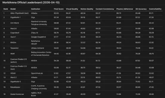 阿里最新推出的“ABot-PhysWorld”世界模型,近日登顶全球权威评测榜单WorldArena,成为继4月初“HappyHorse”登顶Artificial Analysis后,半个月内阿里第二款问鼎世界级榜单的AI模型。WorldArena由清华等8所顶尖高校联合打造,评测体系覆盖16项核心指标和3大真实任务,堪称世界模型领域的“高考”。