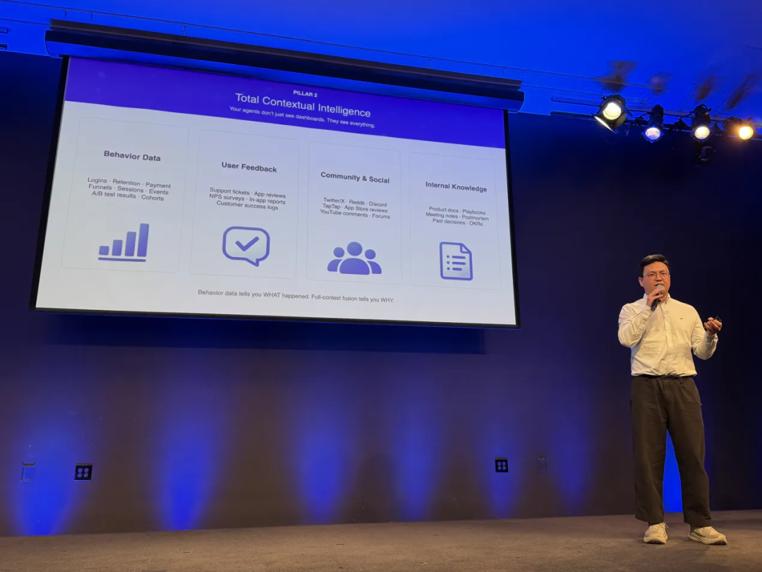 经常有人问韩盼某个品类的平均7日留存是多少。“我只能回答‘不知道’,我们没有数据,但我们有最佳实践,我们知道怎么分析数据。所以一切都跑在你的基础设施里,你的Agent、你的数据和你的模型,完全在你自己的环境里运行。”