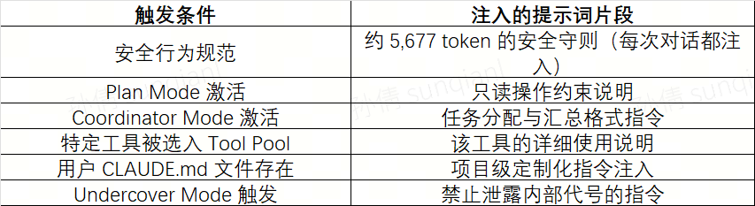 Claude Code 路由设计里最具特色、也最反直觉的部分:Claude Code 没有一个固定的"系统提示词"。它有数百个提示词碎片,在运行时根据当前的模式、工具集合和上下文,动态组装出最终注入的系统提示。以下是几个已知的组装触发条件: