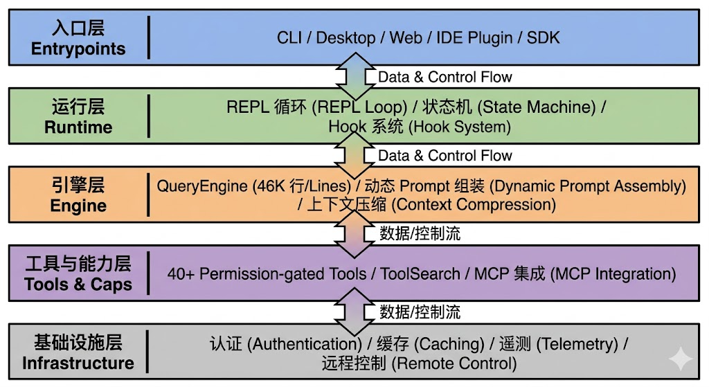 工具与能力层(Tools & Caps):40+ 权限受控工具、ToolSearch、MCP