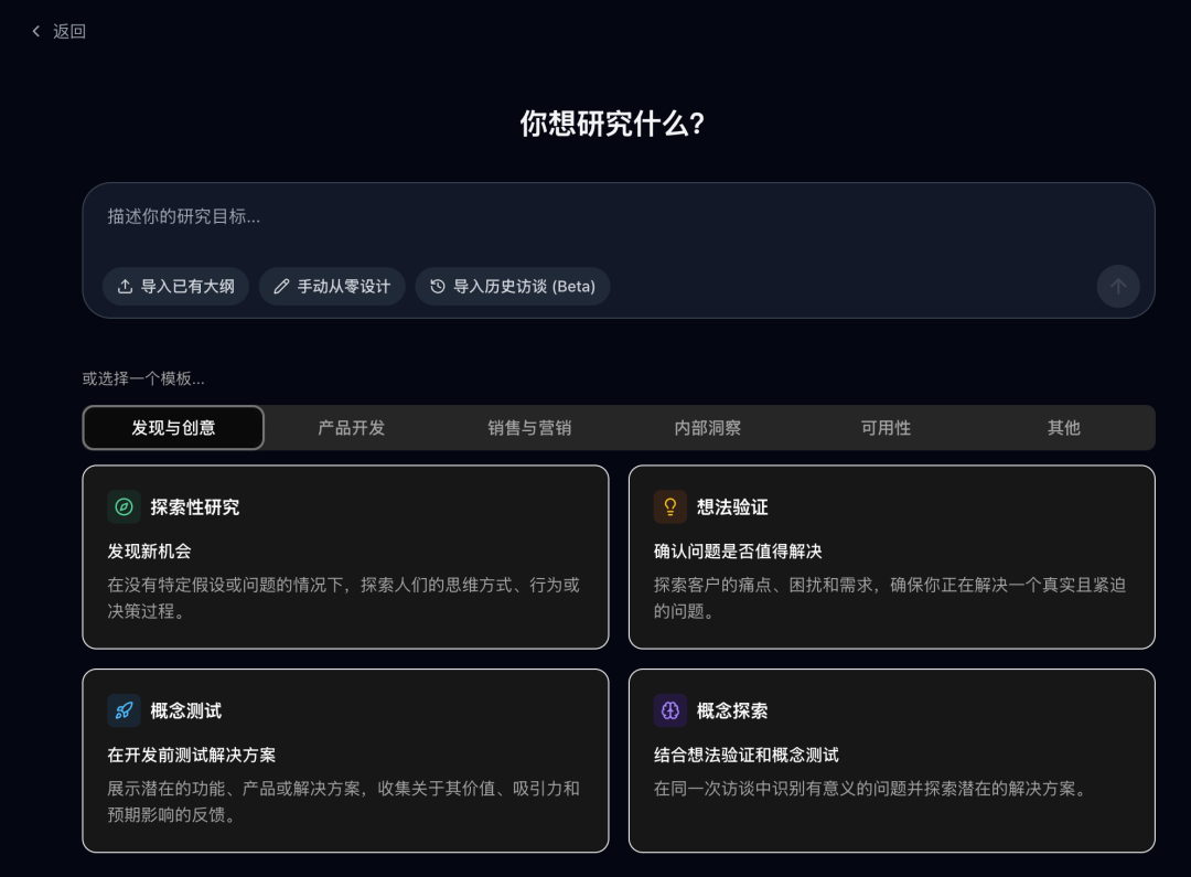 进入产品主界面,就可以开始创建新访谈了。用户可以选择“导入已有大纲”“手动从零开始”或是“导入历史访谈”。再往下看,是一组预设的模板,按场景分成了六个类别,且在每个类别下还有更细分的模板卡片。这套模板设计能够帮使用者明确"这次调研属于什么类型",再匹配对应的研究框架。对于不太有用研经验的用户来说,这些模板是一份很好的方法论指引。