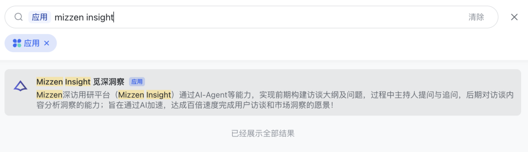 打开飞书,在搜索栏输入"Mizzen Insight", 搜索结果里很快就能找到该的应用入口。点击进入,直接启用,整个过程和开通一个飞书内置功能没什么区别,几乎零门槛。