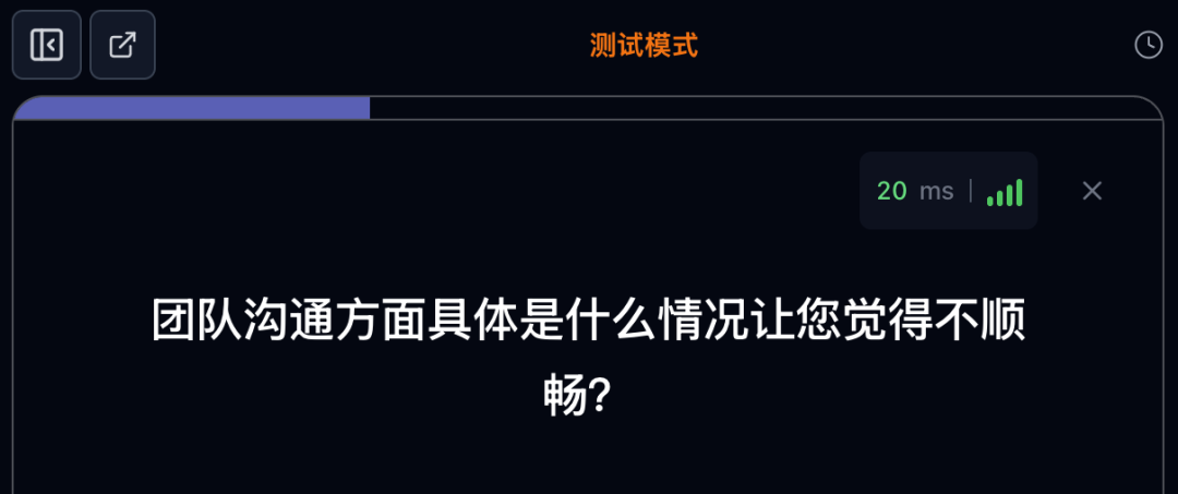 这个追问不是随机的,它基于之前设定的调研目标和上下文,给出了具体的方向引导,但又没有诱导性,使得受访者可以选择其中一个方面展开。在我们给出“团队沟通”这一问题后,它会继续就“团队沟通”展开追问。
