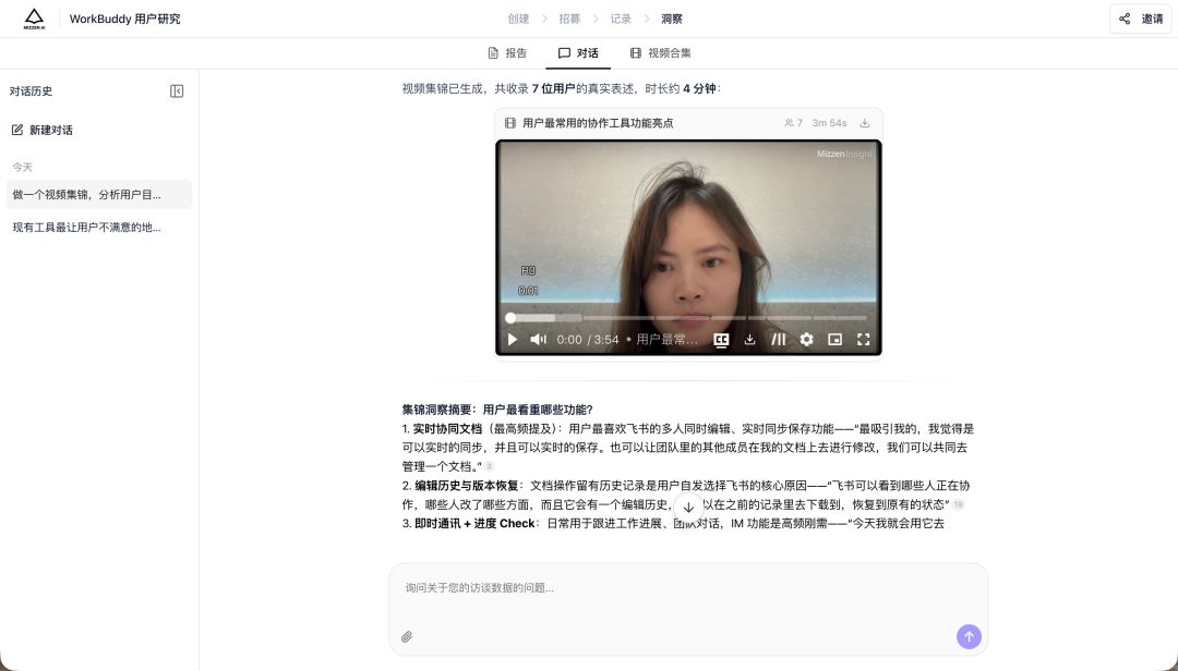 更惊喜的是视频集锦的生成。在对话框输入"做一个视频集锦,分析用户目前最看重哪些功能",47 秒后系统就生成了一段约 4 分钟的视频——从访谈录像中自动剪辑出 7 位用户的真实表述片段,每段都带有受访者编号和时间戳,并提炼出"实时协同文档是最高频提及的功能亮点""编辑历史与版本恢复是用户自发选择飞书的核心原因"等结论。