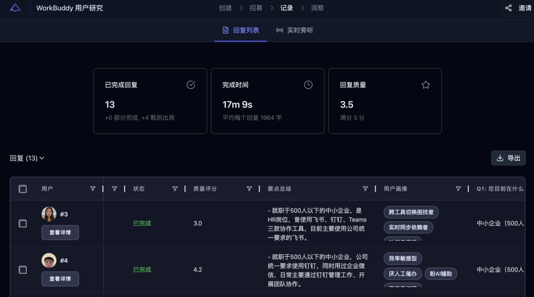 在受访者完成了全部访谈,系统会自动总结平均每场耗时并给出的回复质量评分,同时每一位受访者的回答记录都可溯源。