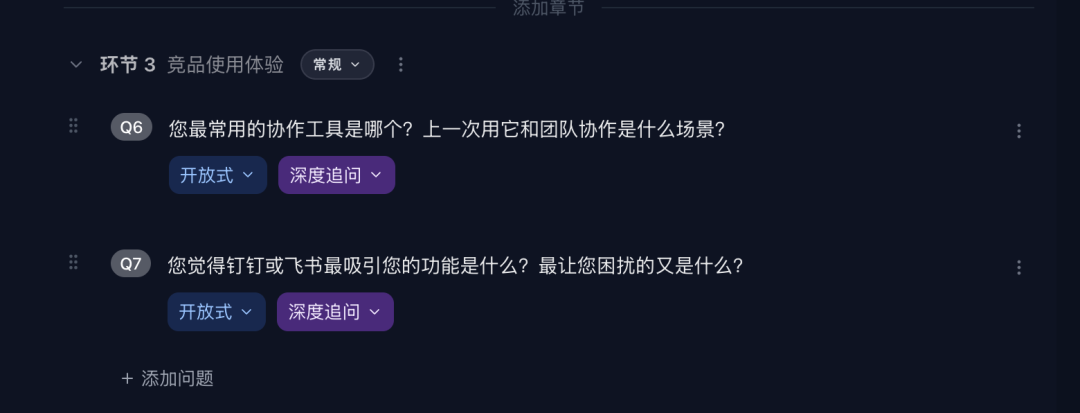 还有一个比较加分的地方,是它在多个开放题后面都标了“深度追问”或“轻度追问”。这一点其实很重要,因为很多 AI 工具虽然也能生成问题,但往往只停留在“把问题列出来”,没有意识到真正有价值的访谈,重点常常在后面的追问。至少从这份结果来看,Mizzen Insight 并没有把访谈当成简单的信息收集。