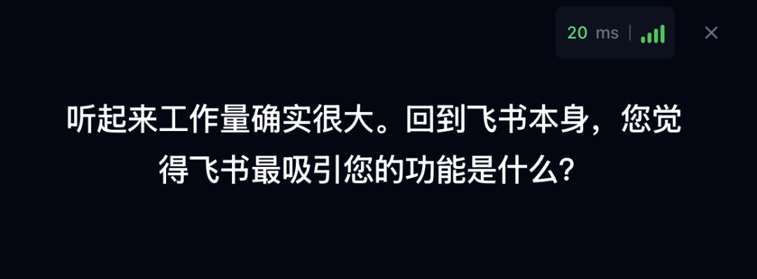 聊到一半,我们故意把话题扯到了一个完全不相关的方向,开始抱怨最近工作太忙。AI 先是简短回应了一下:听起来工作量确实很大,然后很自然地把话题引导回了调研主线:回到飞书本身,您觉得飞书最吸引您的功能是什么?