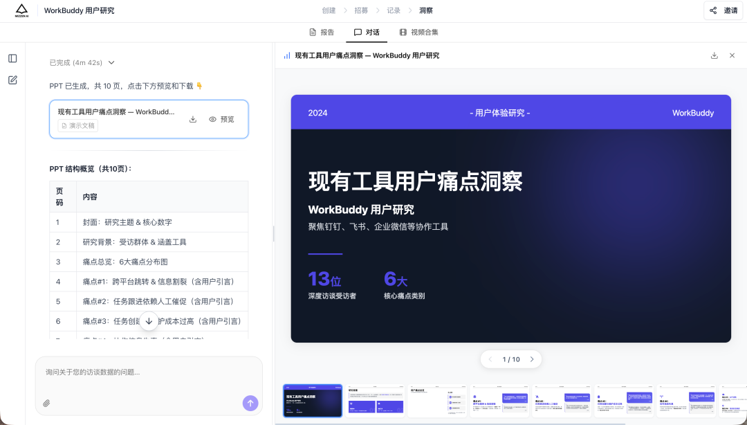 除了看报告,还能在洞察栏目进行对话,直接向 AI 追问。试了一下,输入"关于现有工具最让用户不满意的地方,做一个 PPT",不到 几分钟就生成了一份 10 页的演示文稿——标题、结构、数据引用都已就绪,可以直接下载用于汇报。这意味着洞察是一份可以直接拿去决策的成品。