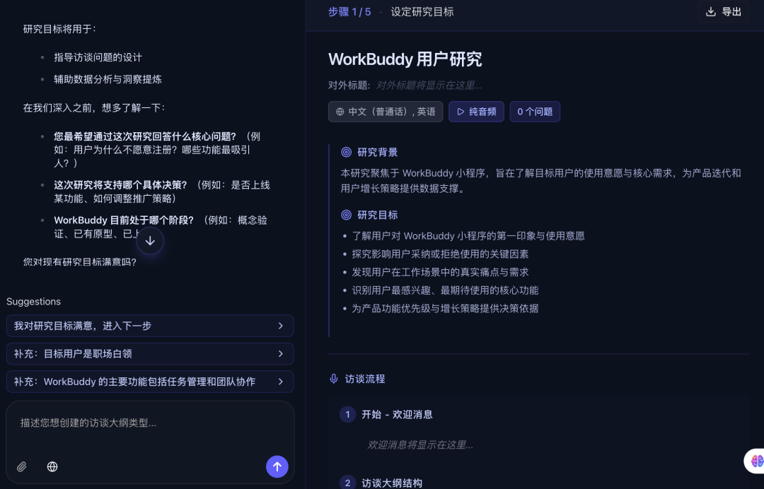 为了体验真实的使用感受,我们在对话框中输入了一个比较粗糙的调研目标:"了解用户对 WorkBuddy 小程序的使用意愿,为产品迭代与用户增长提供决策依据。"