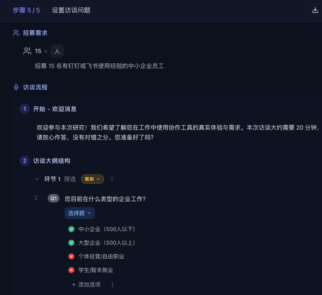 如果说创建任务的体验是“系统”和“方便”,那接下来的 AI 访谈环节才是真正刷新认知的地方。