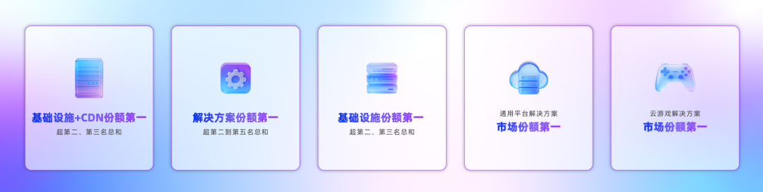 阿里云在这份报告里,以绝对优势拿下了 5 个第一:基础设施+CDN 份额第一、解决方案份额第一 、基础设施份额第一、 通用平台解决方案份额第一、云游戏解决方案份额第一。其中基础设施+CDN 份额、基础设施份额都超第二、第三名总和,解决方案份额更是以 42% 份额超第二到第五名总和。更难得的是,以上统计口径均为商业化市场数据,不计入内部用量。