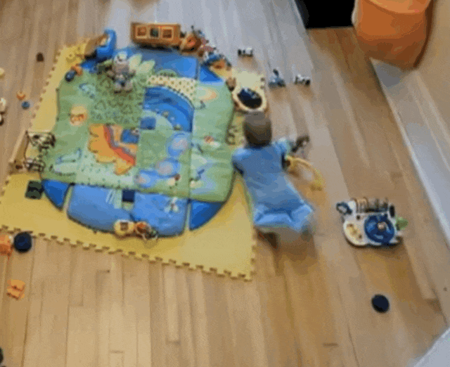 画面中是一名婴儿,视频略微加速过,大家不必担心。你可以看到,婴儿在与各种玩具互动时,并不会只专注于某一个,而是玩一会儿就感到厌倦,随后转向下一个。每一次接触新的玩具,它都会学到一些东西——也许只是发现绳子可以拉、可以放进嘴里,或者可以用不同方式摆弄。但很快,它又会改变对象,通过改变自身的经历,看看还能从新的事物中学到什么。