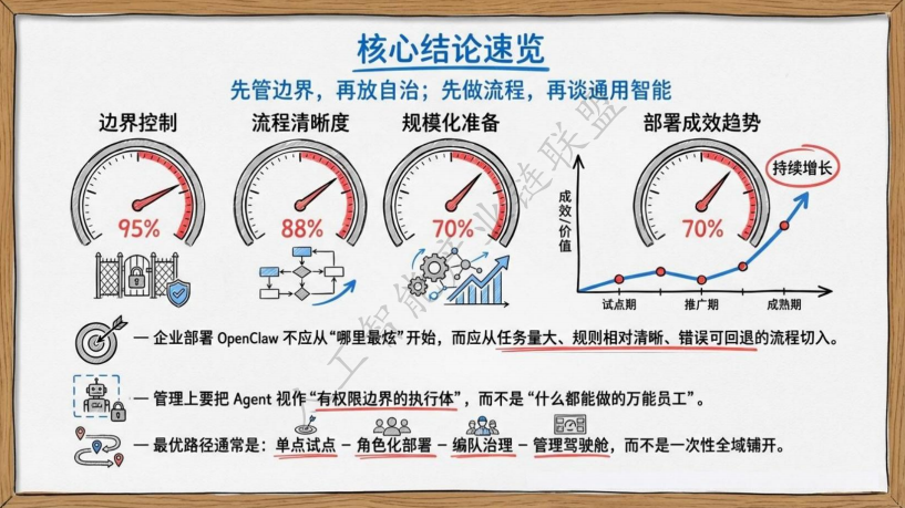 最终形态:建立OpenClaw管理驾驶舱,把经营指标(任务完成率、成本)、风险指标(接管率、异常升级次数)、资产指标(技能复用率、知识库版本数)放到同一张屏上。当这些指标进入管理例会,Agent才真正从“好玩的技术”变成“可经营的能力”。