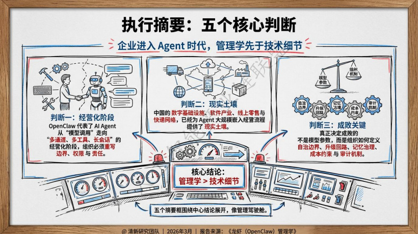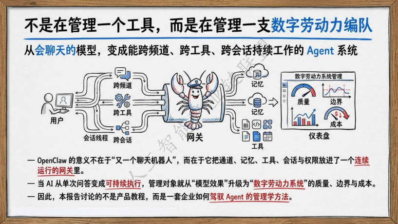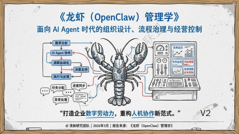 当AI从单次问答变成可持续执行,管理对象就从“模型效果”升级为“数字劳动力系统”的质量、边界与成本。清华大学清新研究团队最新发布的《龙虾(OpenClaw)管理学》报告,以OpenClaw为样本,系统回答了企业如何驾驭AI Agent这一全新的管理命题。以下是报告的完整精华提炼,适合所有正在或准备引入Agent的企业管理者阅读。