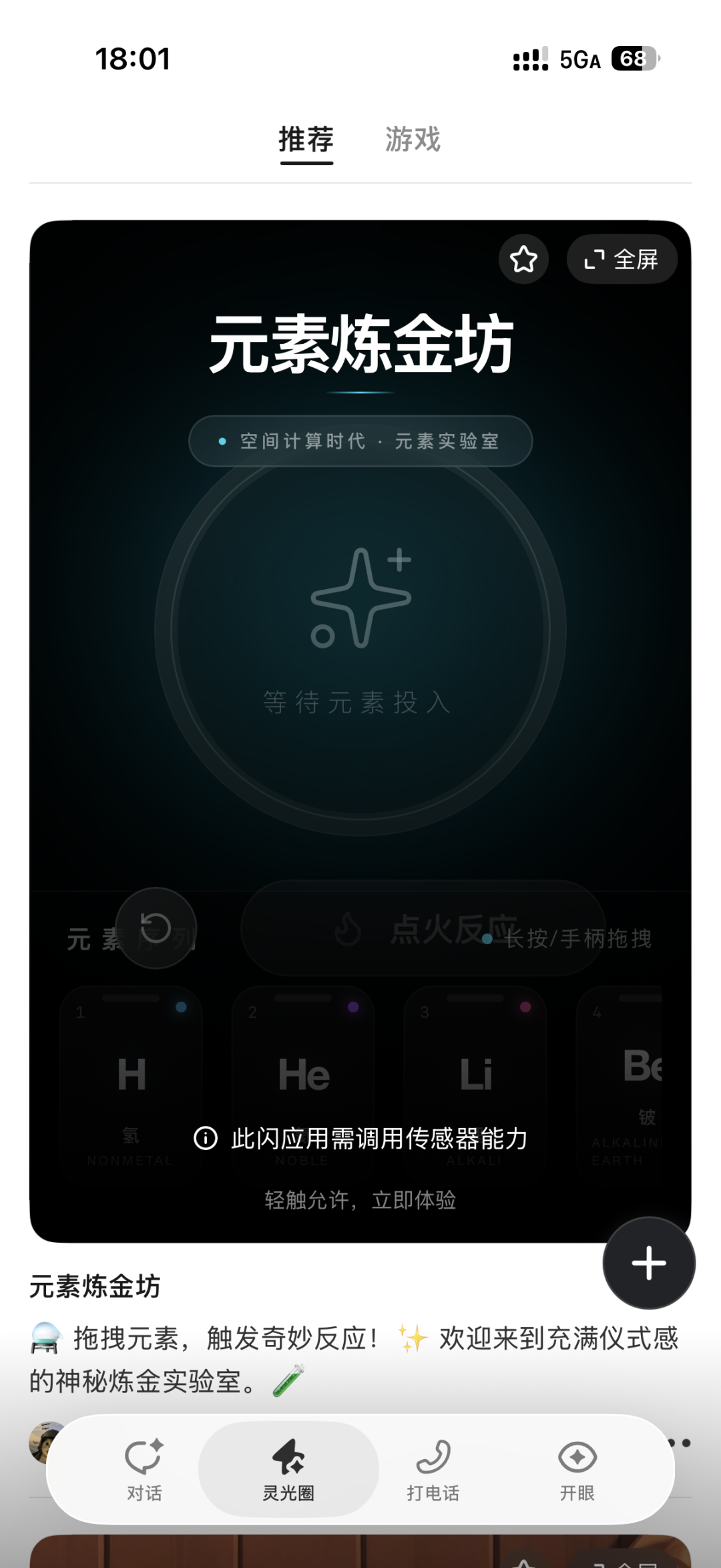 调用传感器能力的闪应用提示界面,底部灰字「轻触允许,立即体验」