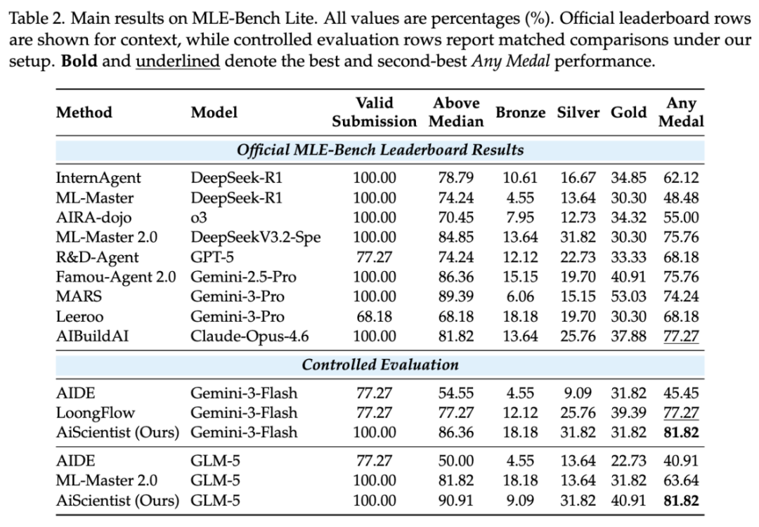 在 MLE-Bench Lite 上,AiScientist 达到了 81.82% Any Medal,说明它不只擅长「先跑出一个版本」,也能在更接近真实实验优化的场景中持续改进结果。