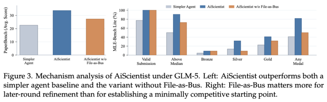 移除 File-as-Bus 后,AiScientist 在 PaperBench 上下降 6.41 分,在 MLE-Bench Lite 上 Any Medal 下降 31.82 个百分点。这说明,状态连续性并不是一个「有更好、没有也行」的辅助设计,而是长程研究工程里真正决定系统能否持续推进的重要机制。