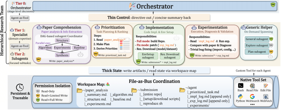 AiScientist 并不是把所有事都交给同一个 agent 去完成,而是让不同角色分别处理论文理解、任务规划、代码实现、实验执行与诊断修复等环节。这样做的目的,不只是「多几个 agent」,而是让每个角色都在更合适的局部上下文里工作。