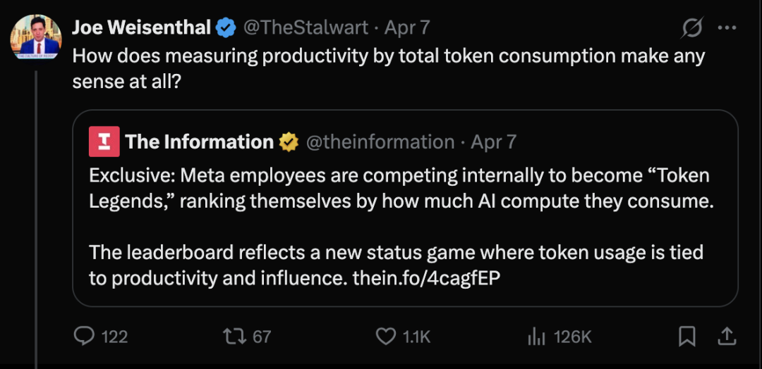 彭博社旗下知名媒体人 Joe Weisenthal 在 X 平台上直接质问道:“用 token 总消耗量来衡量生产力究竟有什么意义?”