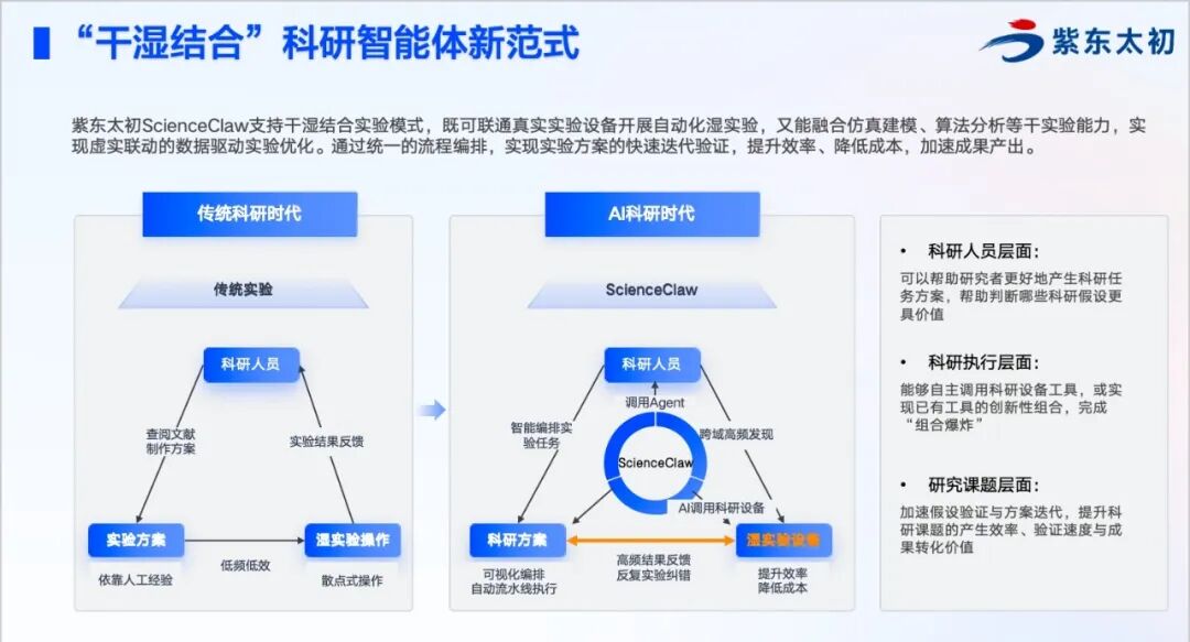 与此同时,围绕干湿实验深度融合,系统既能支撑文献理解、方案设计、数据分析等“干实验”环节,也能深入设备联动、流程执行与实验反馈等“湿实验”场景,推动科研流程从分散协作走向一体化智能闭环。它不仅更会“思考”,更真正具备“看得见、调得动、做得成”的能力,正在推动AI从辅助分析走向现实世界操作,形成面向科研与产业场景的新质生产力。