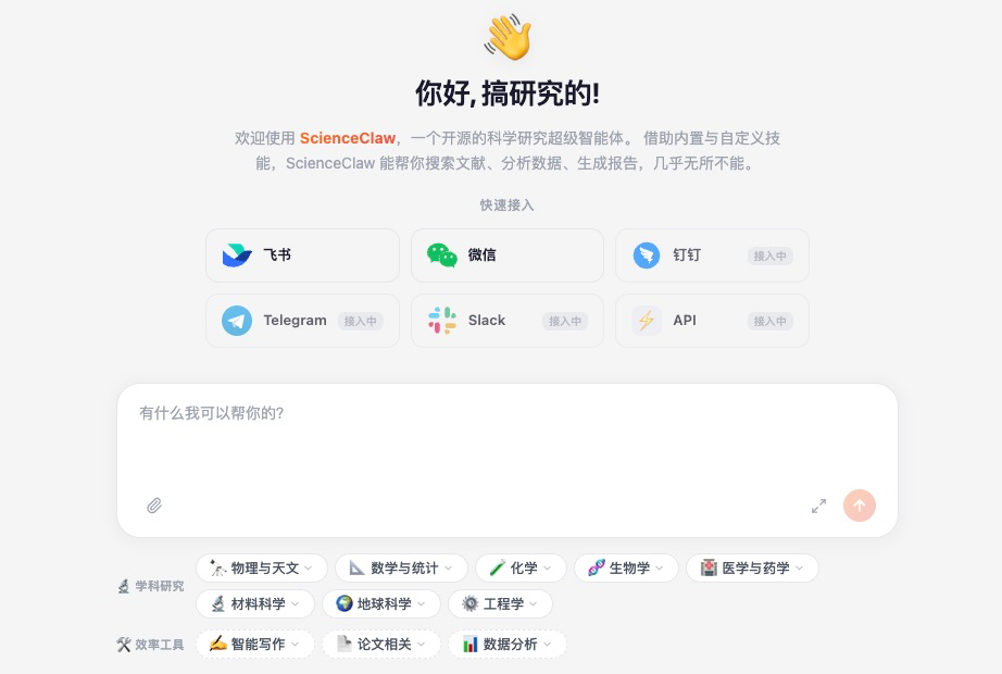 专业力:8大学科覆盖、3000+科研工具与技能,懂“行话”、懂“流程”,可以拆解专业任务,按照科研的逻辑、流程去自动执行。开箱即用,告别环境配置,只要接入飞书、企业微信这些主流办公平台,就能直接使用。