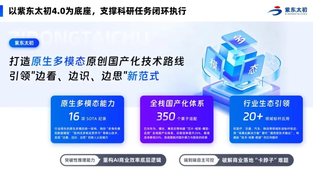 2025年9月发布的紫东太初4.0,成为全球首个“深度推理+多模态”大模型,该模型采用行业领先的原生多模态统一架构,独创“多角色模拟数据增强”“批判式多轮反思学习”等核心技术,实现“边看、边识、边思”的类人认知能力,更一举创造了16项SOTA纪录。