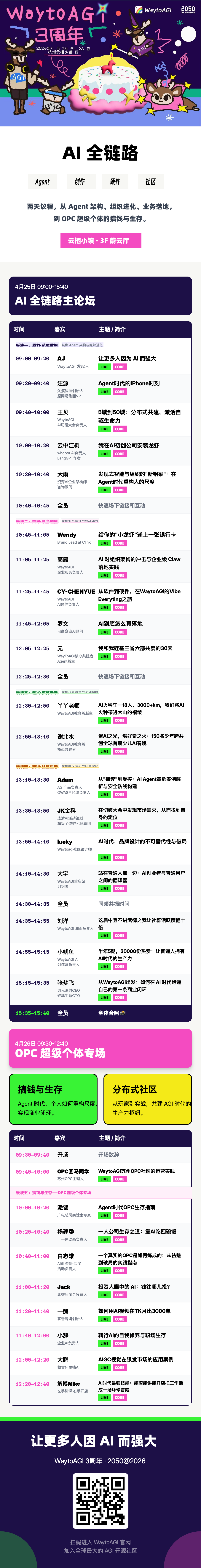 4月25-26日,杭州云栖小镇。WaytoAGI 三周年,来见面吧!