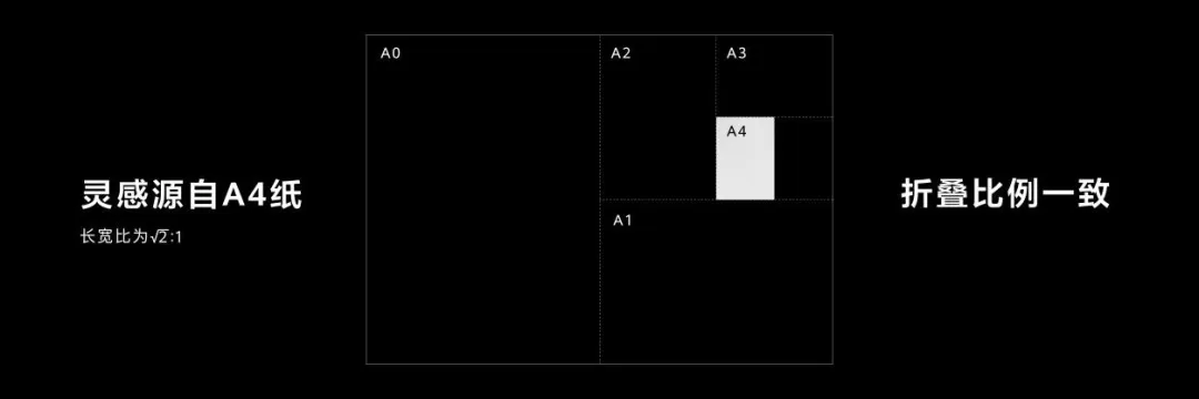 华为常务董事、终端 BG 董事长余承东在发布会上,把这个比例追溯到了 A4 纸,称其为「A4 纸 √2:1 黄金比例设计」。这个比例的特殊性在于——把纸沿长边对折,得到的比例不变。所以你把 A4 对折一次是 A5,再对折是 A6,比例始终一致。