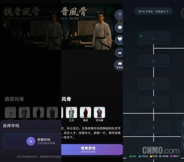 据CNMO了解,“探梦DreamNow”目前有一个《魏晋风骨》的互动影游,用户通过选择不同的剧情分支、做出贴合魏晋时代背景的人物抉择,解锁不一样的故事走向与结局。从相关图片能看到,该互动影游的界面设计贴合魏晋的国风美学,AI生成的视觉基调搭配古朴的字体样式,将时代氛围感拉满,剧情选择节点的按钮布局简洁明了,操作上无任何门槛,轻触即可完成选择、推进剧情。