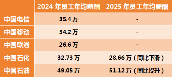 据悉,中国电信2024年度的员工平均年薪为35.4万元,中国移动为34.2万元,中国联通为26.6万元,中石化则为32.73万元,与中国电信和中国移动相差不大。