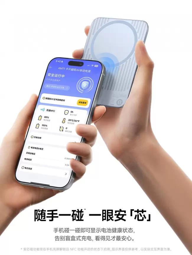针对新国标对智能安全管理的升级要求,倍思更进一步推出NFC安芯碰技术。用户只需用手机轻触产品指定区域,即可一键查看电池温度、循环次数、电压电流等核心状态,告别传统 “盲盒式” 充电,让安全从被动防护变为主动可视,每一次使用都清晰放心。