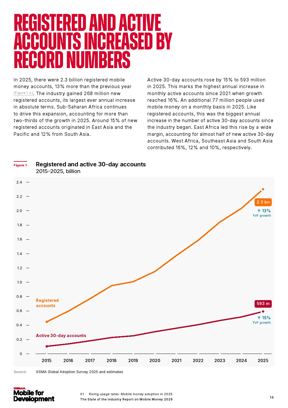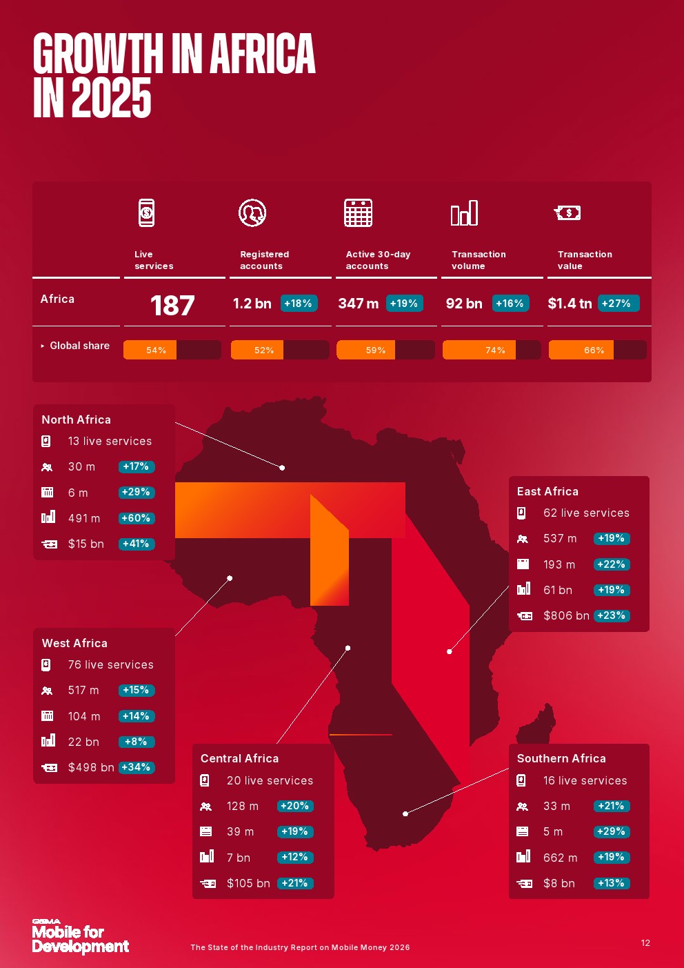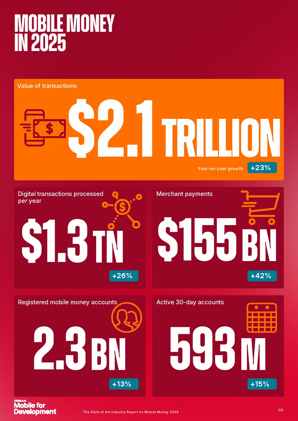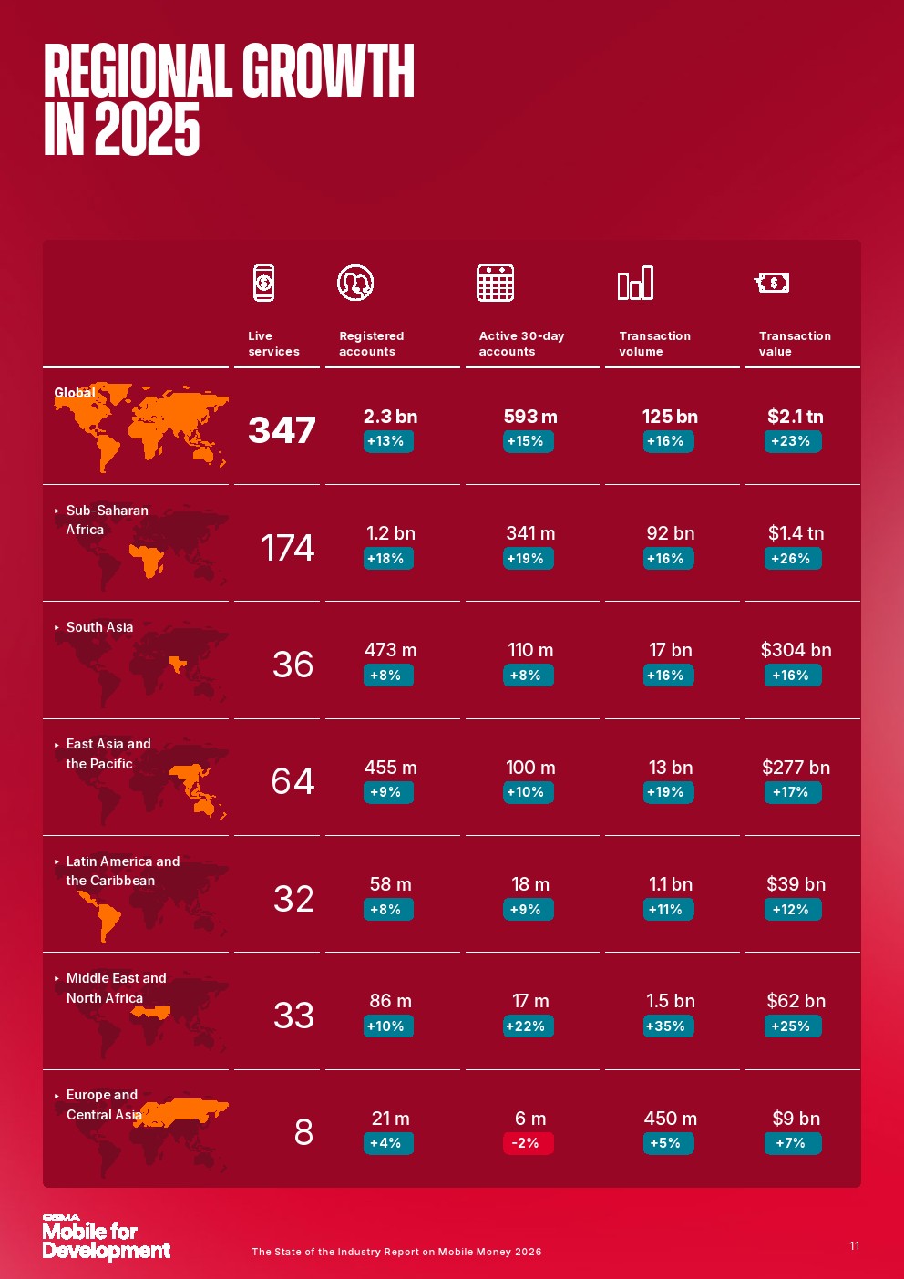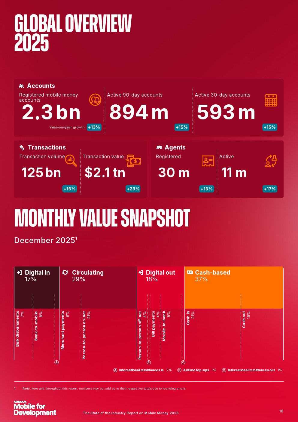 移动货币诞生仅25年,如今已成为全球服务不足人群的主流金融服务,赋能那些无法获得传统银行服务的人群,并为移动货币所在国家的经济增长做出贡献。报告还发现,2025年移动货币注册账户达到23亿,增长了2.68亿。